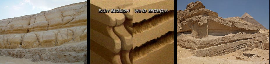Right panel: photo of a limestone quarry adjacent to the The Great Pyramid of Giza, dated by Egyptologists to Old Kingdom times showing only wind erosion.